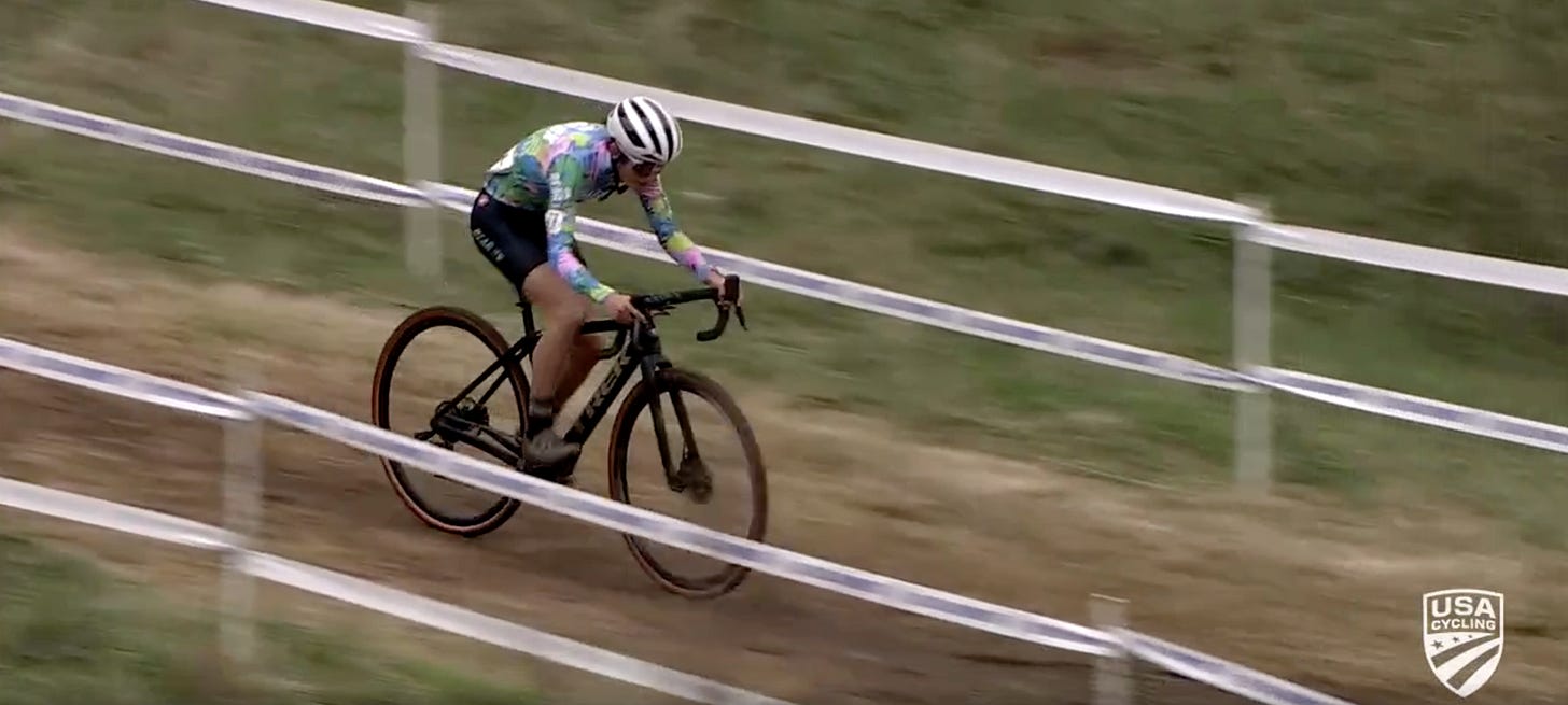 The almost-19-year-old from California piloted her cyclocross bike around the course in Louisville to a second place finish in the collegiate relay race, a leg opener for the elite race on Saturday.
